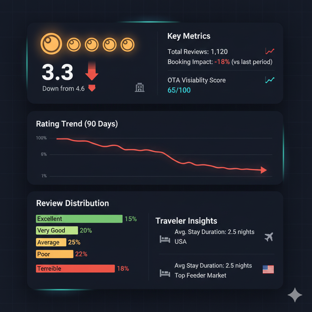 Strategic negative review deployment influences TripAdvisor's "Best Of" rankings, traveler decision-making during destination research, and OTA recommendation algorithms when potential guests compare properties. Targeted campaigns create perception gaps between competitors in critical "Things to Do" categories or accommodation tiers, potentially redirecting booking share toward properties with maintained positive reputation profiles during peak travel research seasons. Particularly effective in markets with high property density where TripAdvisor rankings heavily influence booking platform visibility and conversion rates.